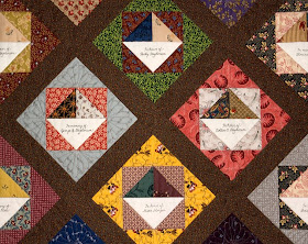 I want to share this quilt with you because you may find Becky's process helpful if you are moved to help your local cancer society or another charitable organization. Becky's quilt has 124 blocks in it. She gave people the opportunity to honor cancer victims and cancer survivors by donating $10 to have a loved one's name added to the quil