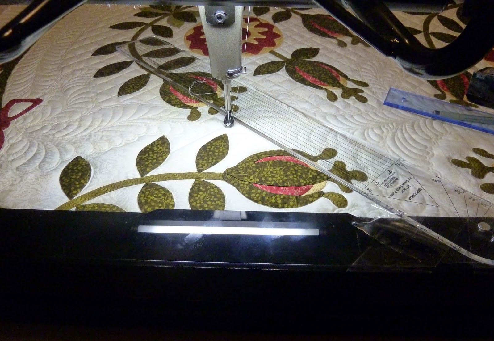 You know I never work on one project at a time, so what else have I been working on? A friend of mine made a Borrowed Roses quilt; mine is shown below. It's based on a quilt designed and made by Rose Kretsinger in the 1930s. Rose was a prolific designer who made her first quilt when she was forty years old; she did it as a form of therapy while grieving over the loss of her mother. When she made her own "New Rose Tree Quilt," she not only designed the applique motifs... she designed the quilting motifs. Friends of mine were able to visit the museum with Rose's quilt in it, and took pictures of the quilting in her quilt - and my quilt replicates Rose's quilt design, as seen below. Okay, but what have I been working on? That quilt is three years old! Well, a friend of mine used my pattern and made the same quilt. She asked me if we could collaborate and if I would quilt her quilt for her. Sharon is a good friend, so how could I say no? So here are some photos of Sharon's quilt, quilted by me. I start by quilting in the ditch around all of the applique, then I go back and quilt all of the feathered vines and shells, while adding piano keys (straight lines) in the borders. My quilt, above, had cross-hatching in the borders, but Sharon's is a little different. I like the piano keys!