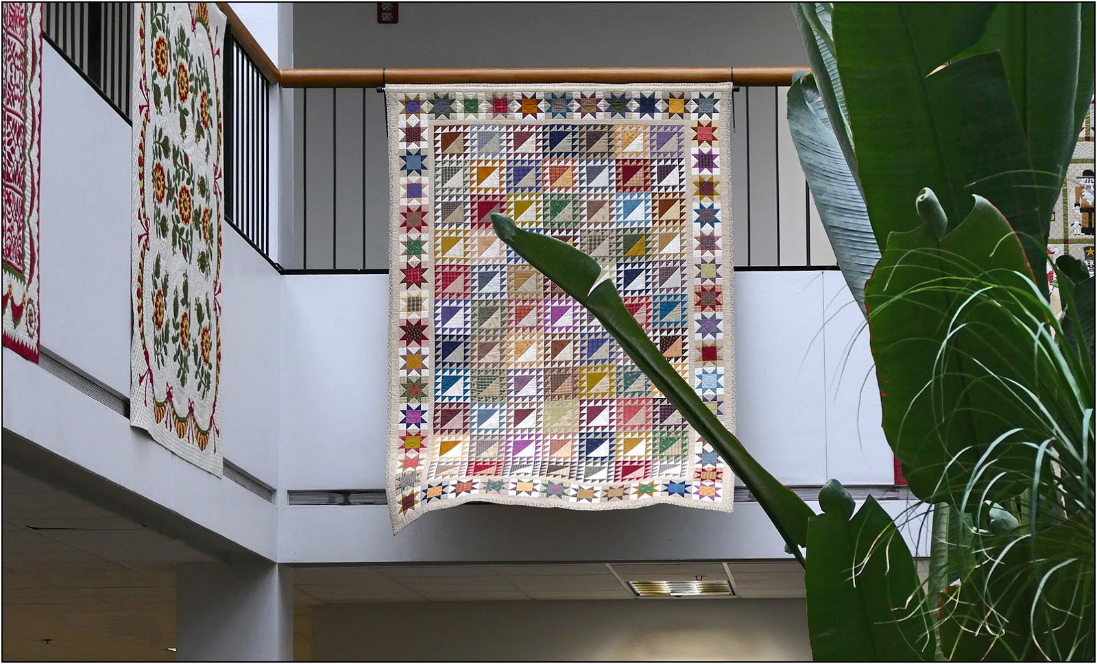 Second, in planning Mom's Celebration of Life, we knew that we wanted to hang at least a couple of her quilts for people to enjoy. We turned to some of her close quilting friends for help, and WOW is all we could say. They did a fabulous job of hanging almost thirty of her quilts around the reception area and on the stage of the theater. I don't think we'd ever seen them all hung together like that, and it was really a spectacular view for everyone. Please enjoy the photos...